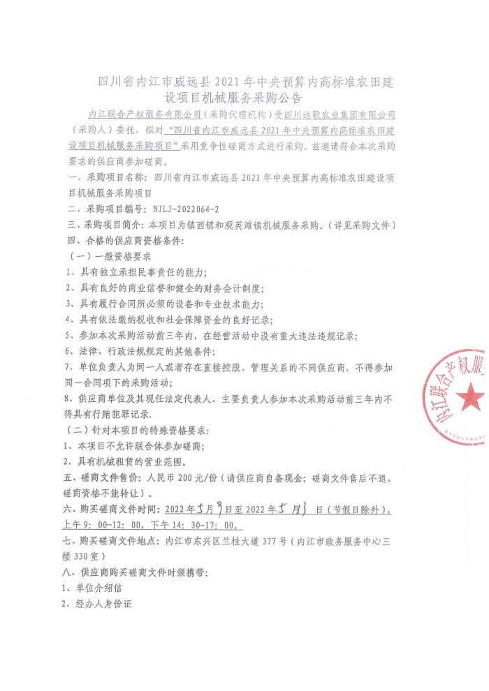 四川省内江市威远县2021年中央预算内高标准农田建设项目机械服务采购公告