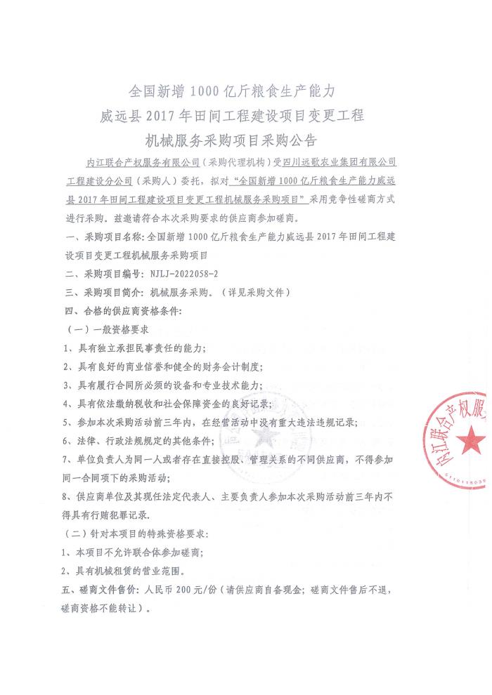 全国新增1000亿斤粮食生产能力威远县2017年田间工程建设项目变更工程机械服务采购公告