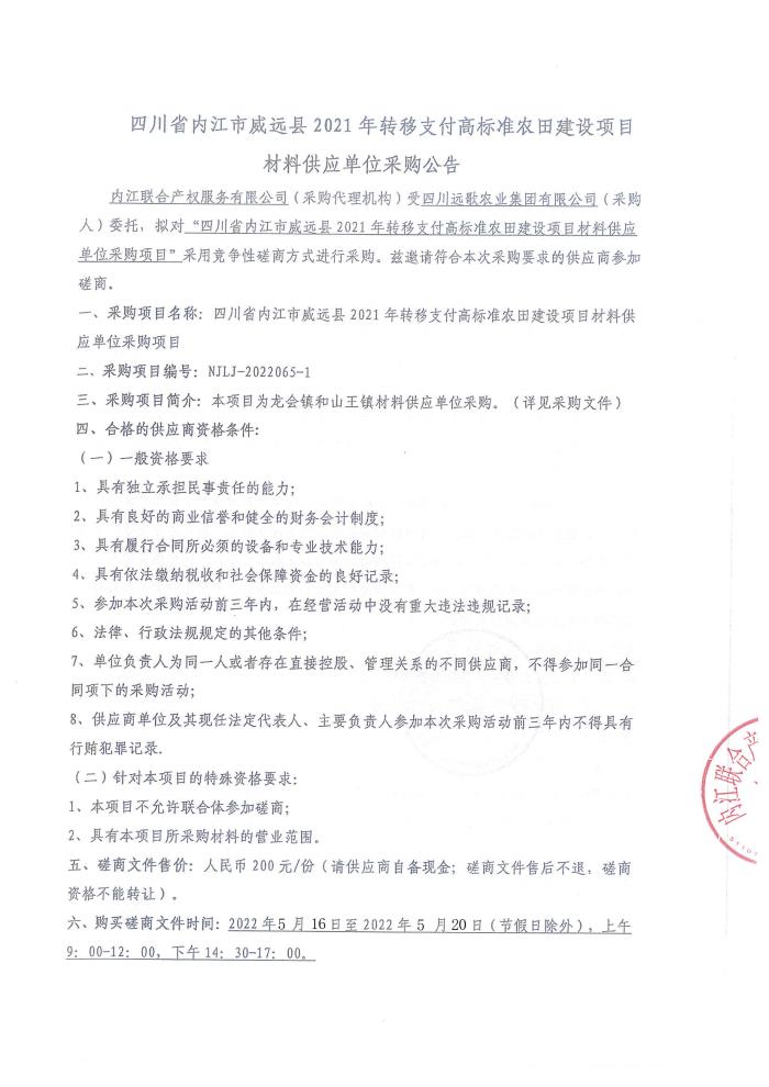 四川省内江市威远县2021年转移支付高标准农田建设项目材料供应单位采购公告