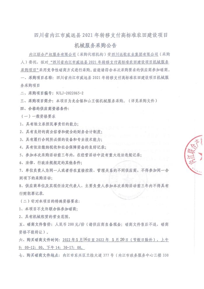 四川省内江市威远县2021年转移支付高标准农田建设项目械服务采购公告