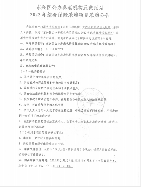 东兴区公办养老机构及救助站2022年 综合保险采购项目采购公告