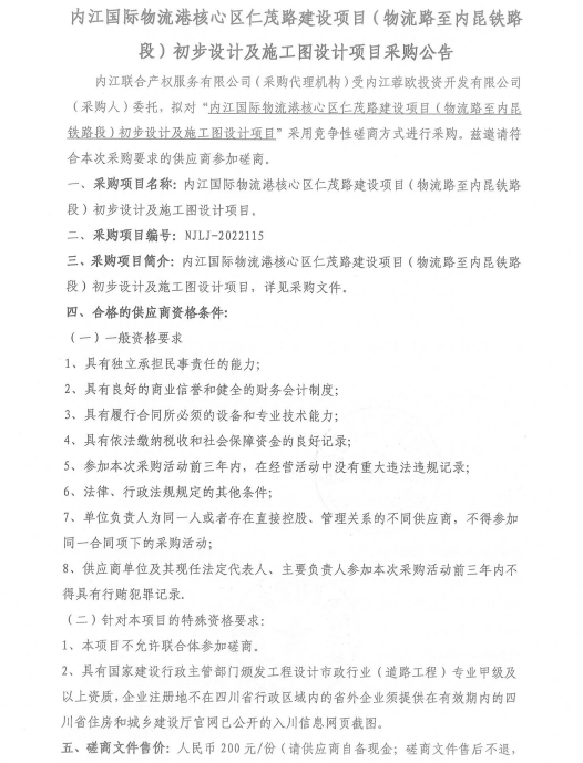 内江国际物流港核心区仁茂路建设项目(物流路至内昆铁路段)初步设计及施工图设计项目采购公告