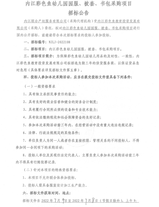 内江彩色鱼幼儿园园服、被套、书包采购项目招标公告