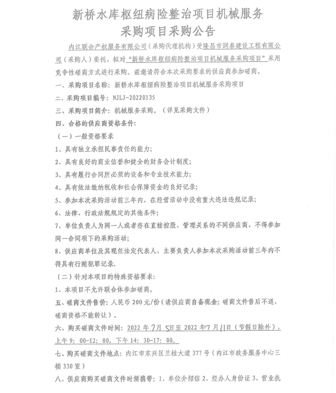 新桥水库枢纽病险整治项目机械服务采购项目采购公告