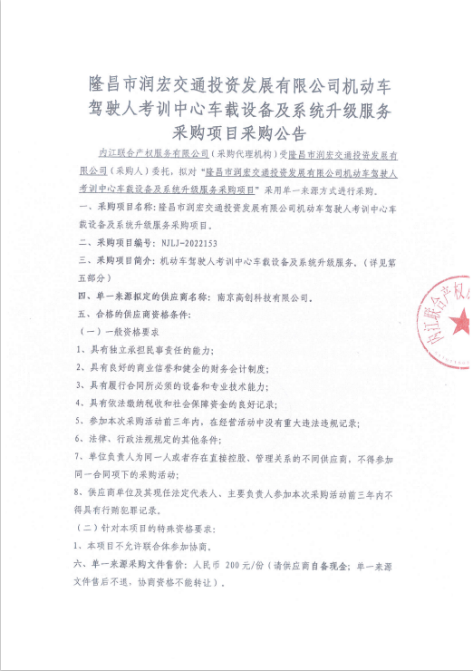 隆昌市润宏交通投资发展有限公司机动车驾驶人考训中心车载设备及系统升级服务采购项目采购公告