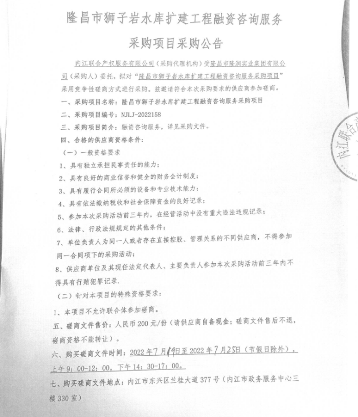 隆昌市狮子岩水库扩建工程融资咨询服务采购项目采购公告