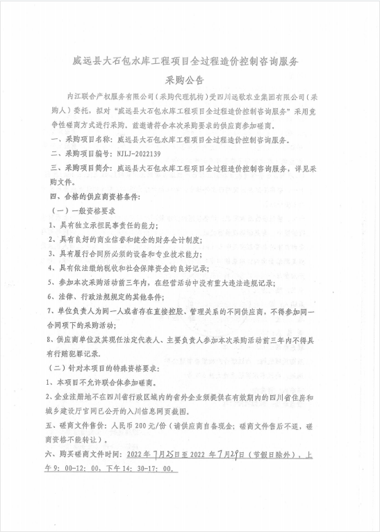 威远县大石包水库工程项目全过程造价控制咨询服务采购公告
