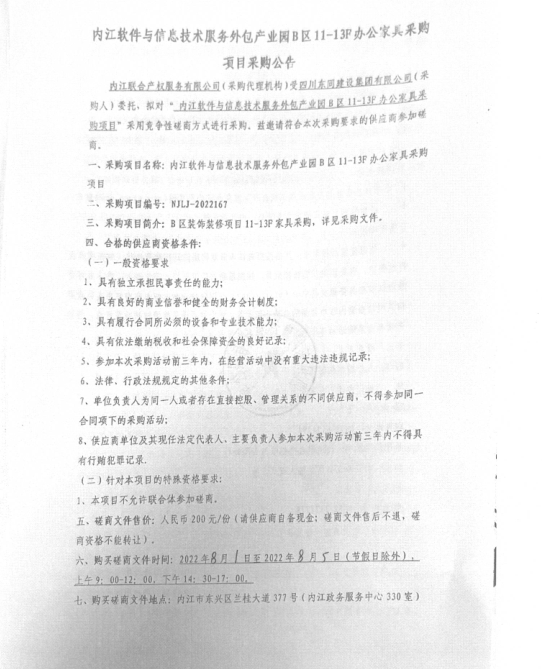 内江软件与信息技术服务外包产业园B区11-13F办公家具采购项目采购公告