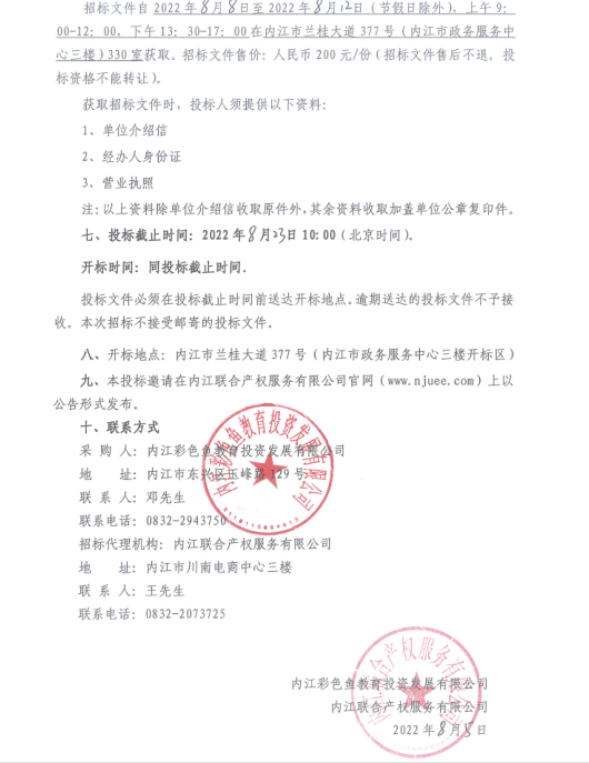 内江彩色鱼教育投资发展有限公司2022-2023年度肉类、食蔬、干货等采购项目招标公告