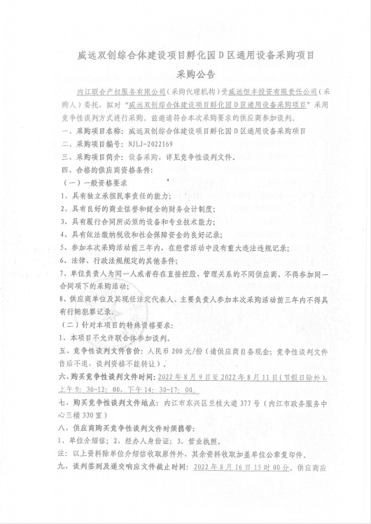 威远双创综合体建设项目孵化园D区通用设备采购项目采购公告