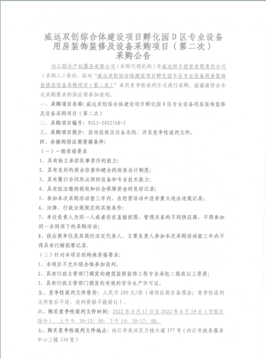 威远双创综合体建设项目孵化园D区专业设备用房装饰装修及设备采购项目(第二次)采购公告