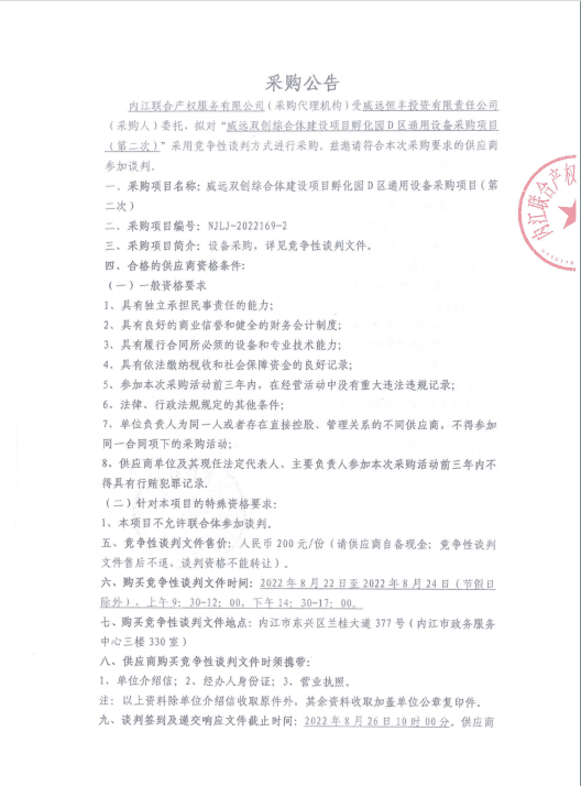 威远双创综合体建设项目孵化园D区通用设备采购项目(第二次)采购公告