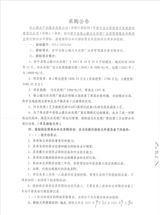 资中县银山镇污水处理厂运营管理服务采购项目采购公告