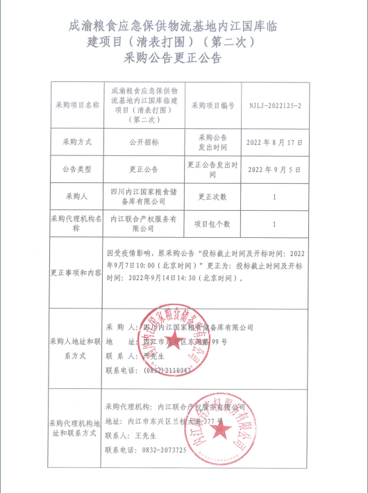 成渝粮食应急保供物流基地内江国库临建项目(清表打围)(第二次)采购公告更正公告