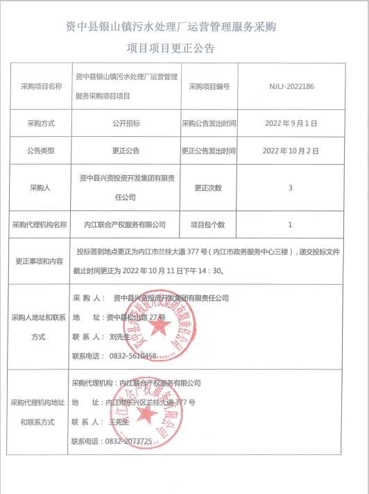 资中县银山镇污水处理厂运营管理服务采购项目项目更正公告