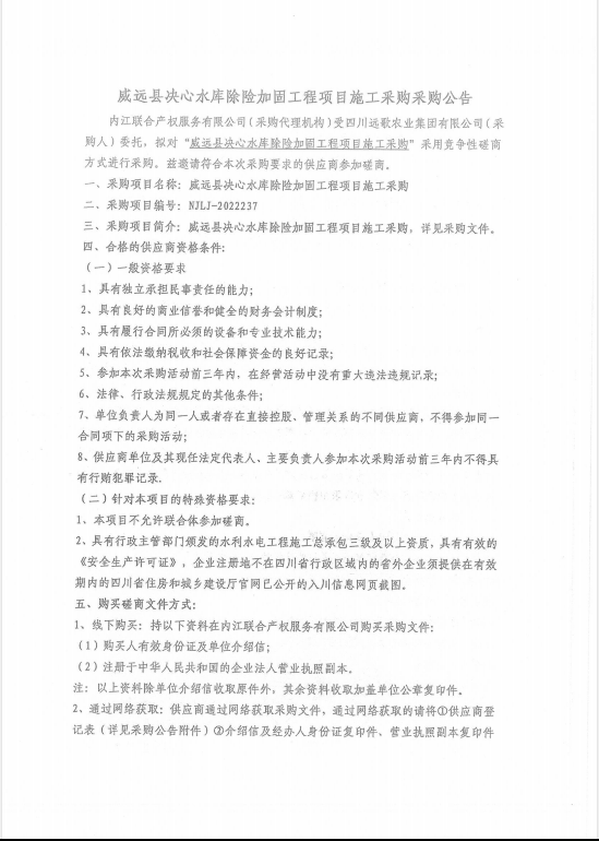 威远县决心水库除险加固工程项目施工采购采购公告