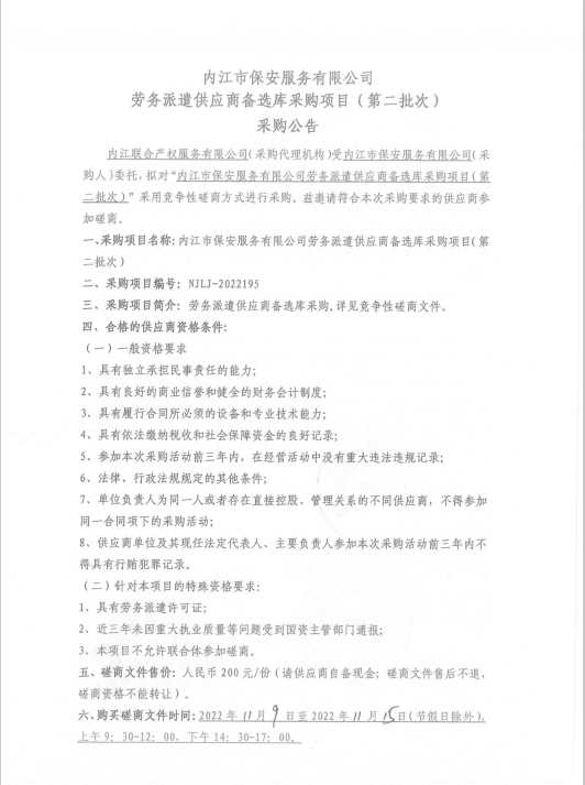 内江市保安服务有限公司劳务派遣供应商备选库采购项目(第二批次)采购公告
