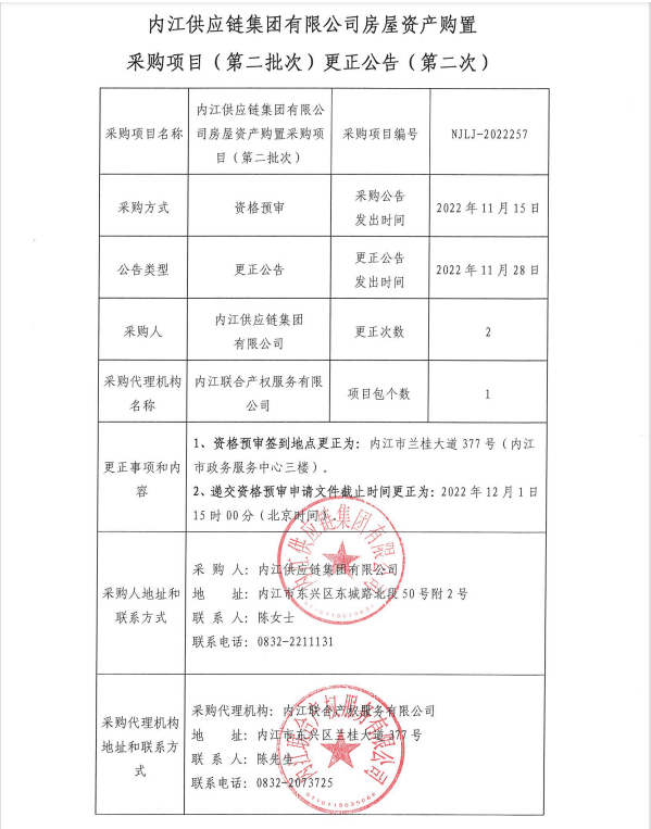 内江供应链集团有限公司房屋资产购置采购项目(第二批次)更正公告(第二次)