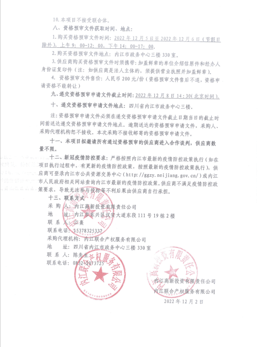 内江高新投资有限责任公司固定资产购置项目(第二次)资格预审采购公告