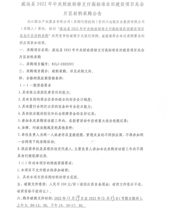 威远县2022年中央财政转移支付高标准农田建设项目龙会片区材料采购公告