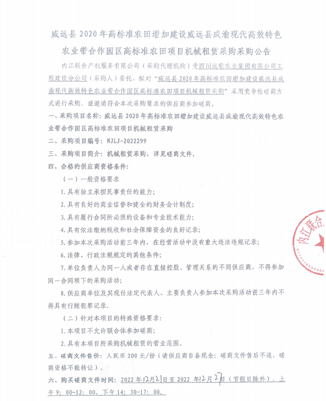 威远县2020年高标准农田增加建设威远县成渝现代高效特色农业带合作园区高标准农田项目机械租赁采购采购公告
