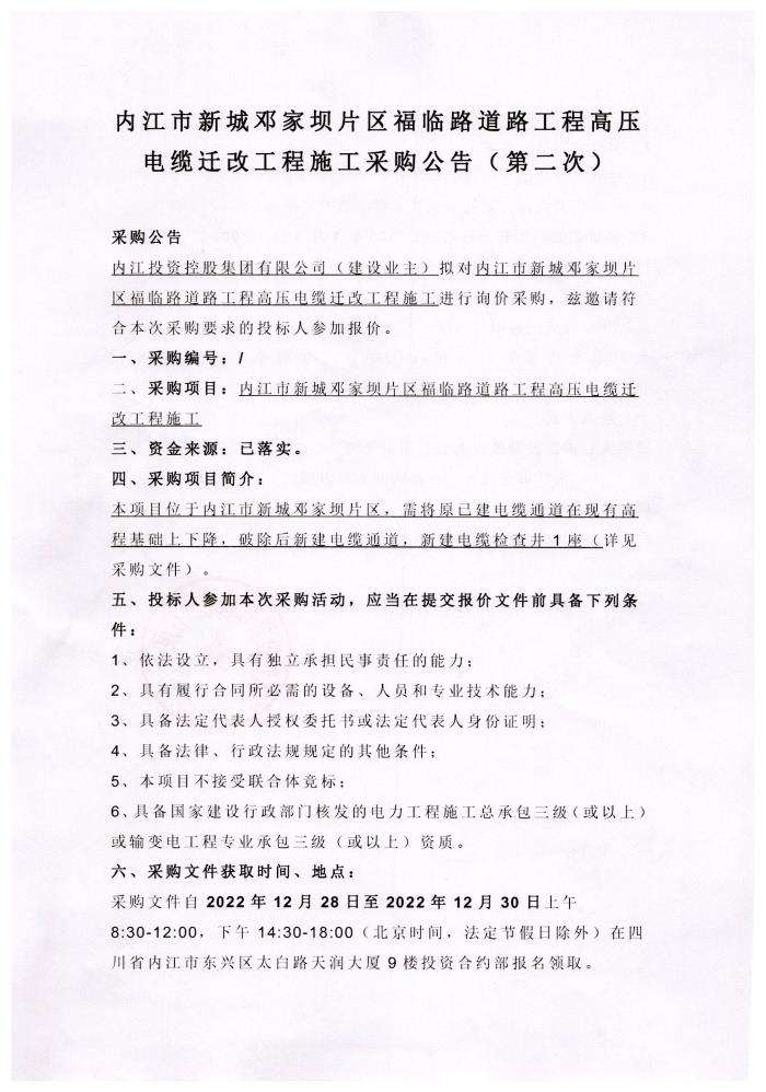 内江市新城邓家坝片区福临路道路工程高压电缆迁改工程施工采购公告(第二次)