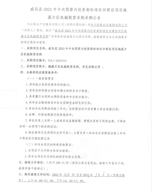 威远县2022年中央预算内投资高标准农田建设项目越溪片区机械租赁采购采购公告