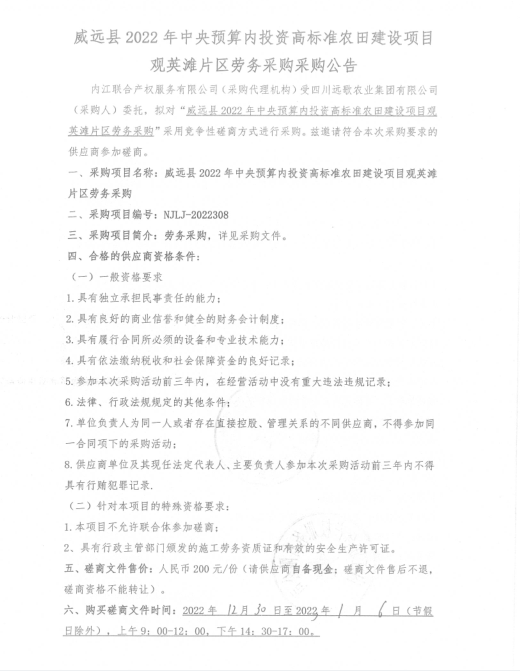 威远县2022年中央预算内投资高标准农田建设项目观英滩片区劳务采购采购公告