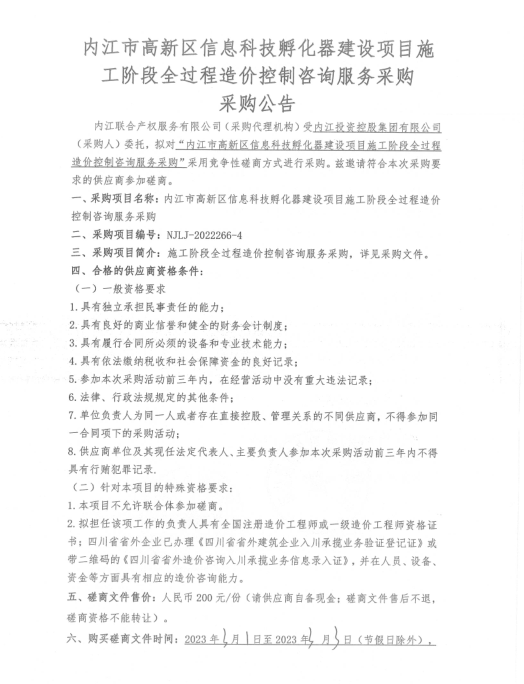 内江市高新区信息科技孵化器建设项目施工阶段全过程造价控制咨询服务采购采购公告