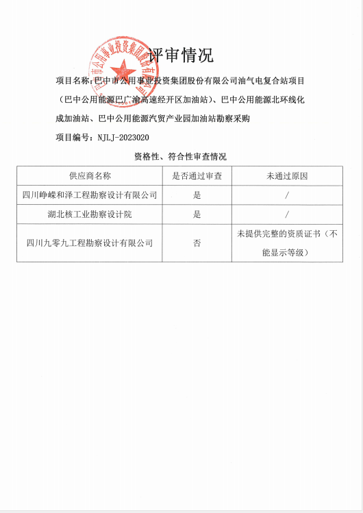 巴中市公用事业投资集团股份有限公司油气电复合站项目(巴中公用能源巴广渝高速经开区加油站)、巴中公用能源北环线化成加油站、巴中公用能源汽贸产业园加油站勘察采购废标公告