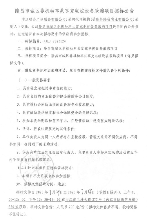 隆昌市城区非机动车共享充电桩设备采购项目招标公告