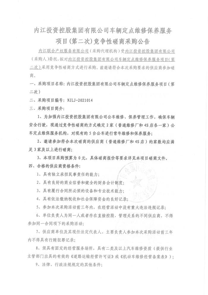 内江投资控股集团有限公司车辆定点维修保养服务项目竞争性磋商采购公告(第二次))