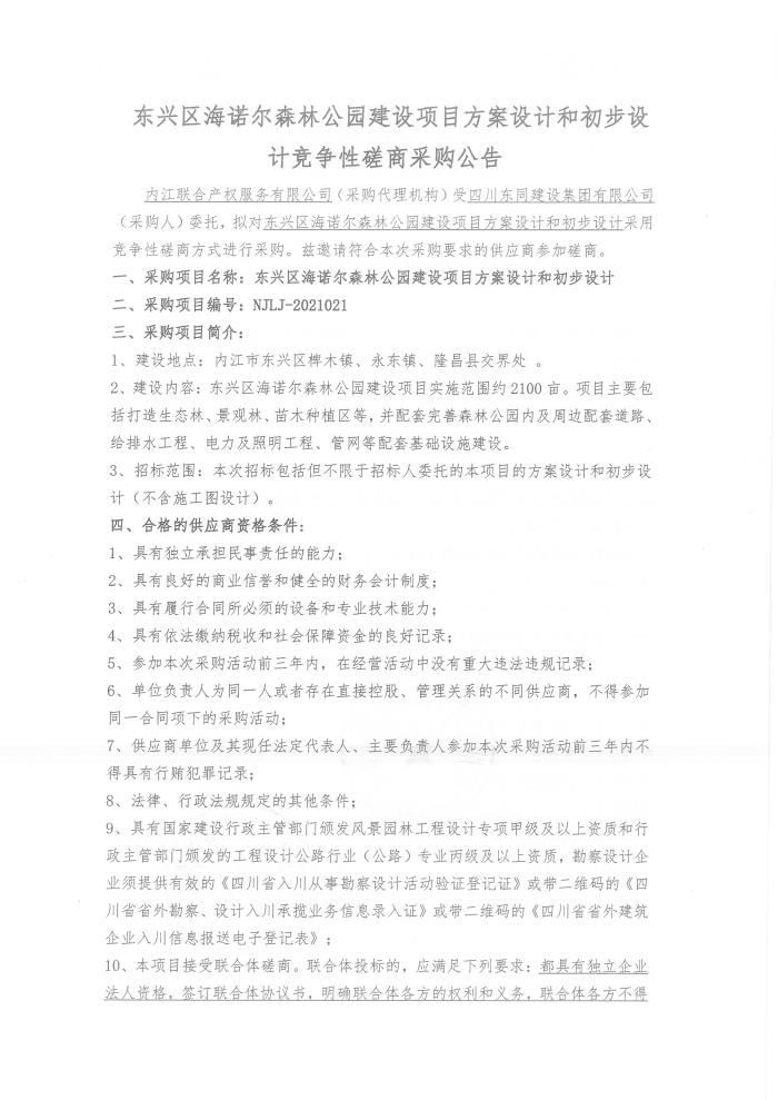 东兴区海诺尔森林公园建设项目方案设计和初步设计竞争性磋商采购公告