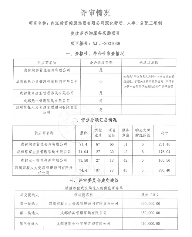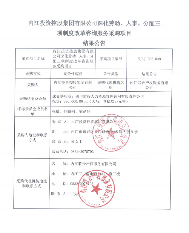 内江投资控股集团有限公司深化劳动、人事、分配三项制度改革咨询服务采购项目结果公告