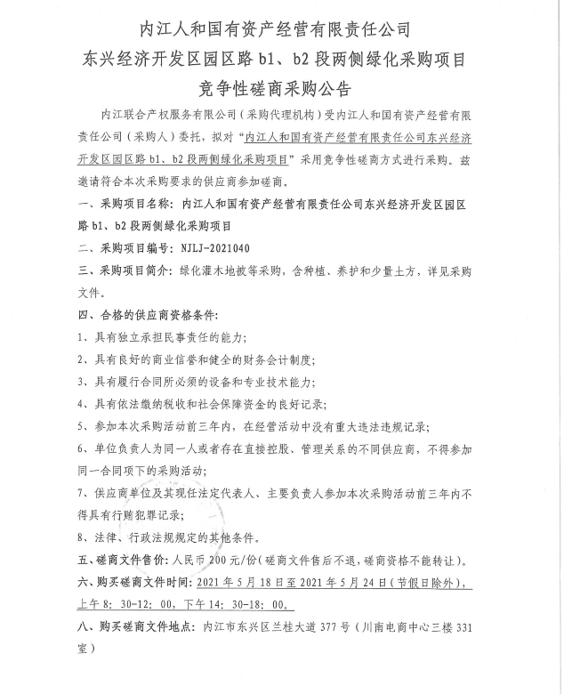 内江人和国有资产经营有限责任公司东兴经济开发区园区路b1、b2段两侧绿化采购项目竞争性磋商采购公告