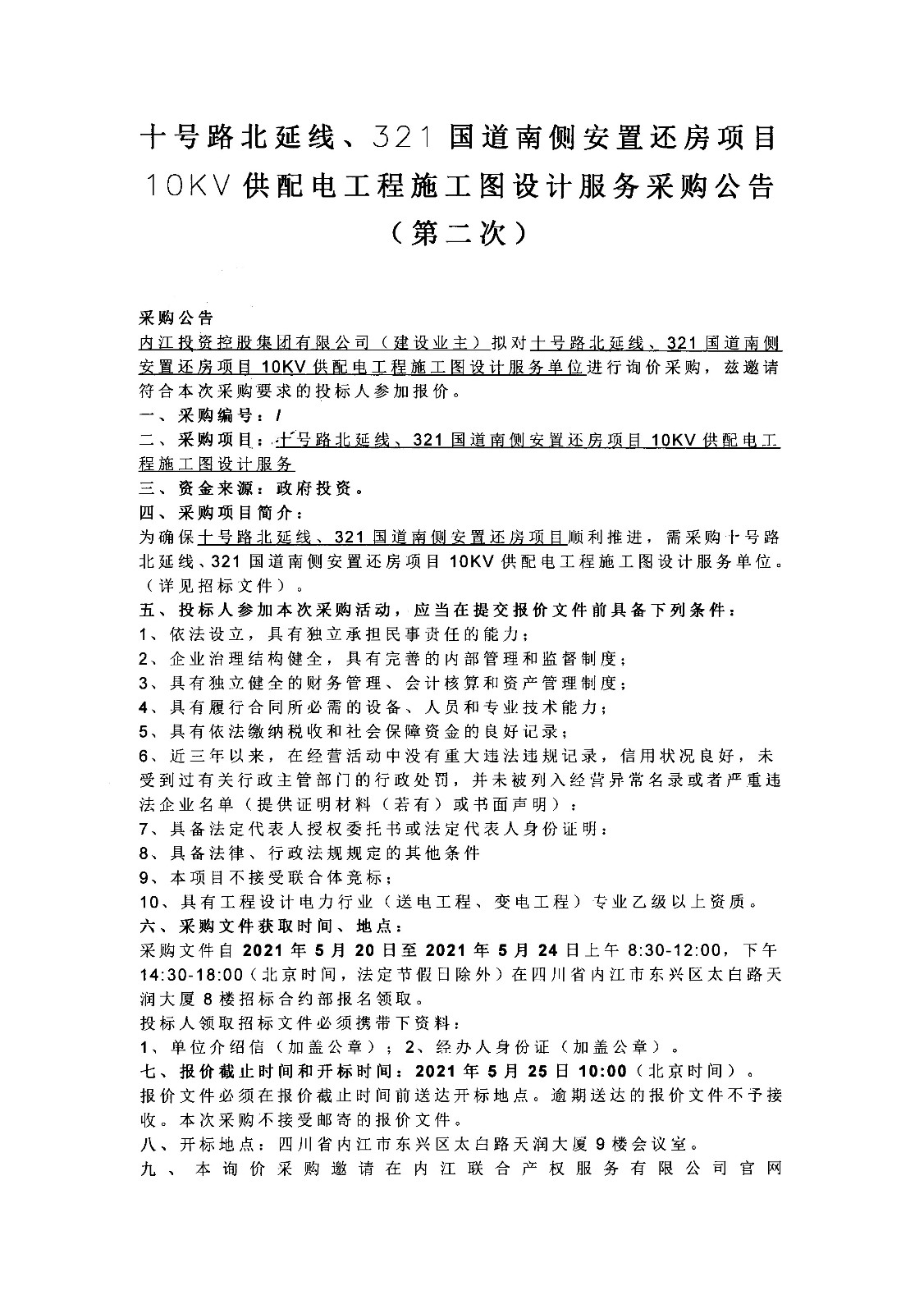 十号路北延线、321国道南侧安置还房项目10KV供配电工程施工图设计服务采购公告(第二次)