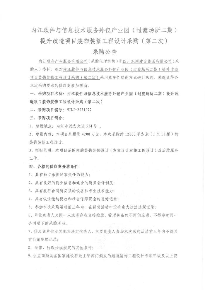 内江软件与信息技术服务外包产业园(过渡场所二期)提升改造项目装饰装修工程设计采购公告 (第二次)
