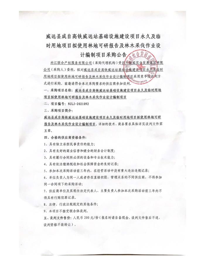 威远县成自高铁威远站基础设施建设项目永久及临时用地项目拟使用林地可研报告及林木采伐作业设计编制项目采购公告