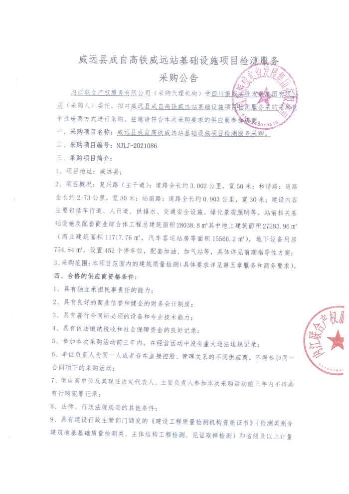 威远县成自高铁威远站基础设施项目检测服务采购公告