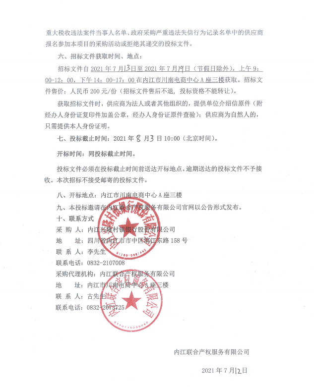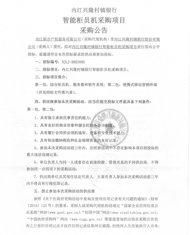 内江兴隆村镇银行自动柜员机(存取款一体机)采购项目