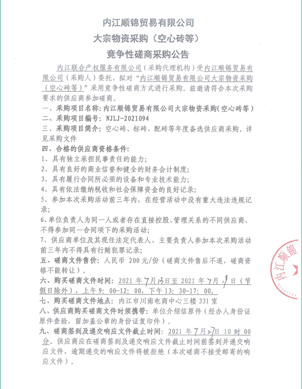 内江顺锦贸易有限公司大宗物资采购(空心砖等)采购项目