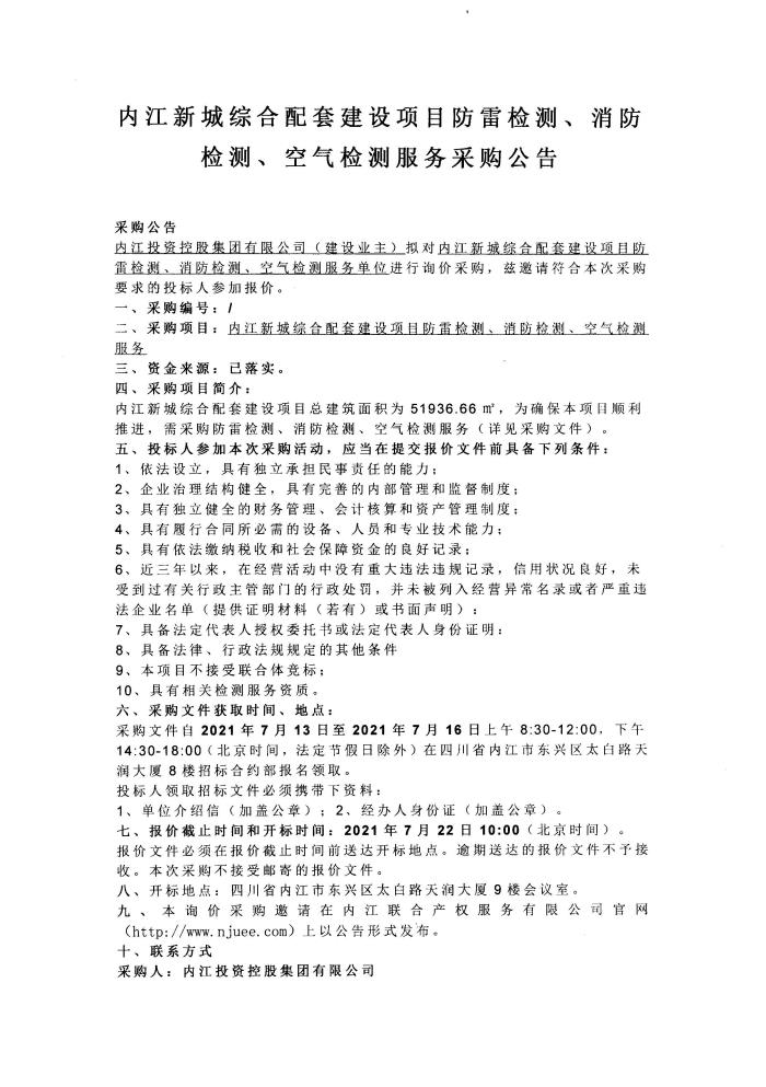 内江新城综合配套建设项目防雷检测、消防检测、空气检测服务采购公告