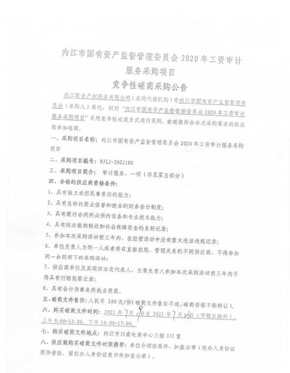 内江市国有资产监督管理委员会2020年工资审计服务采购项目采购公告