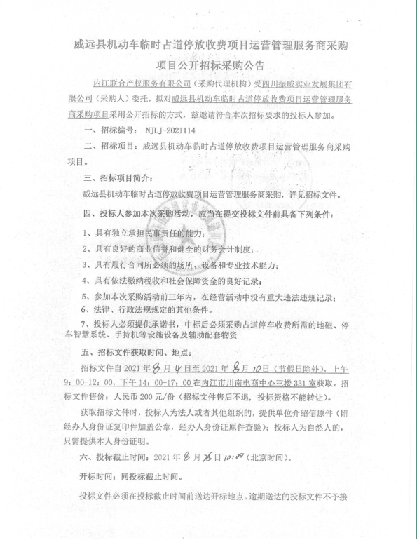 威远县机动车临时占道停放收费项目运营管理服务商采购项目公开招标采购公告