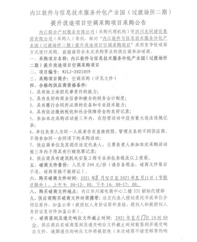 内江软件与信息技术服务外包产业园(过渡场所二期)提升改造项目空调采购项目