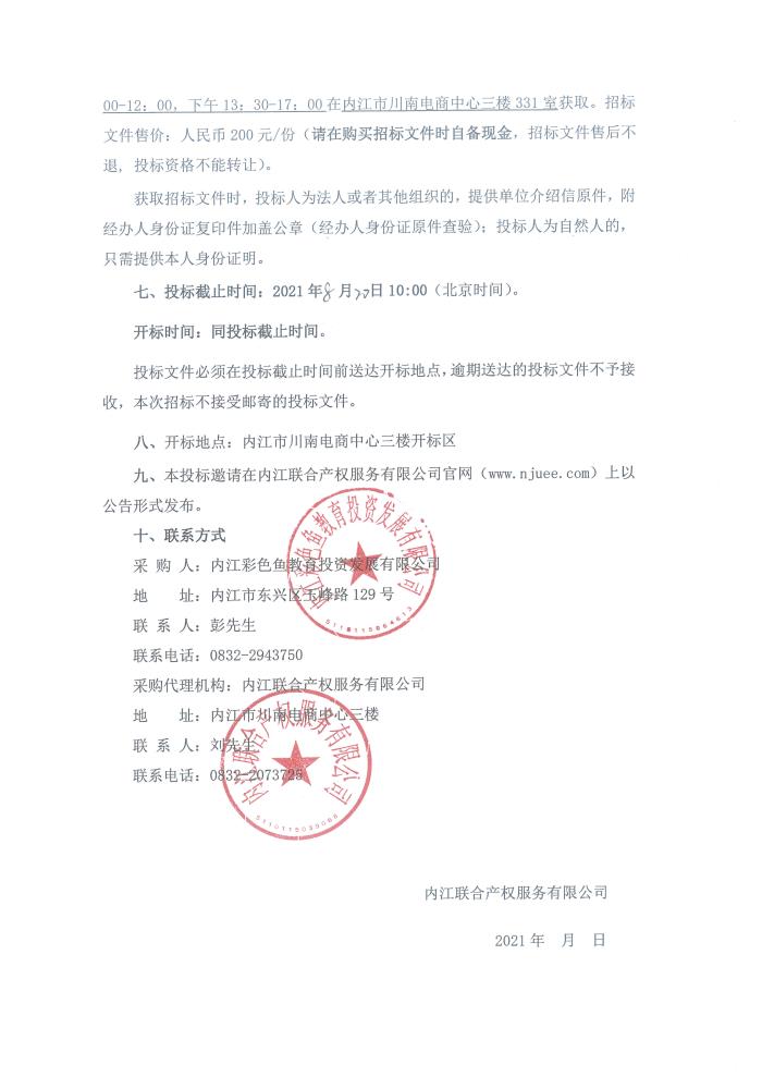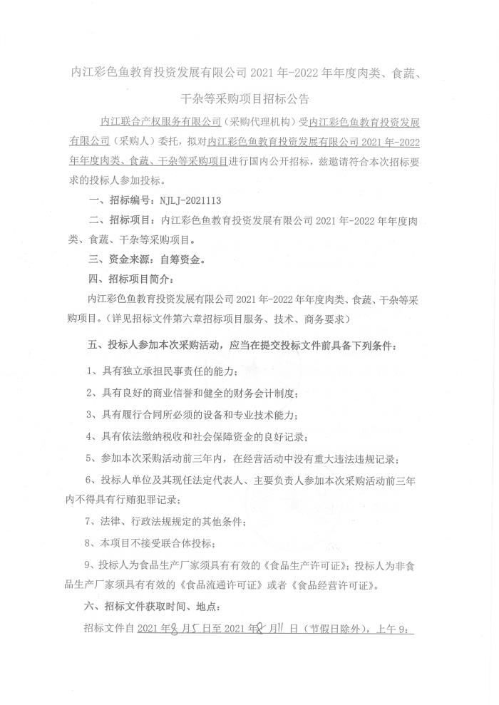 内江彩色鱼教育投资发展有限公司2021年-2022年年度肉类、食蔬、干杂等采购项目采购公告