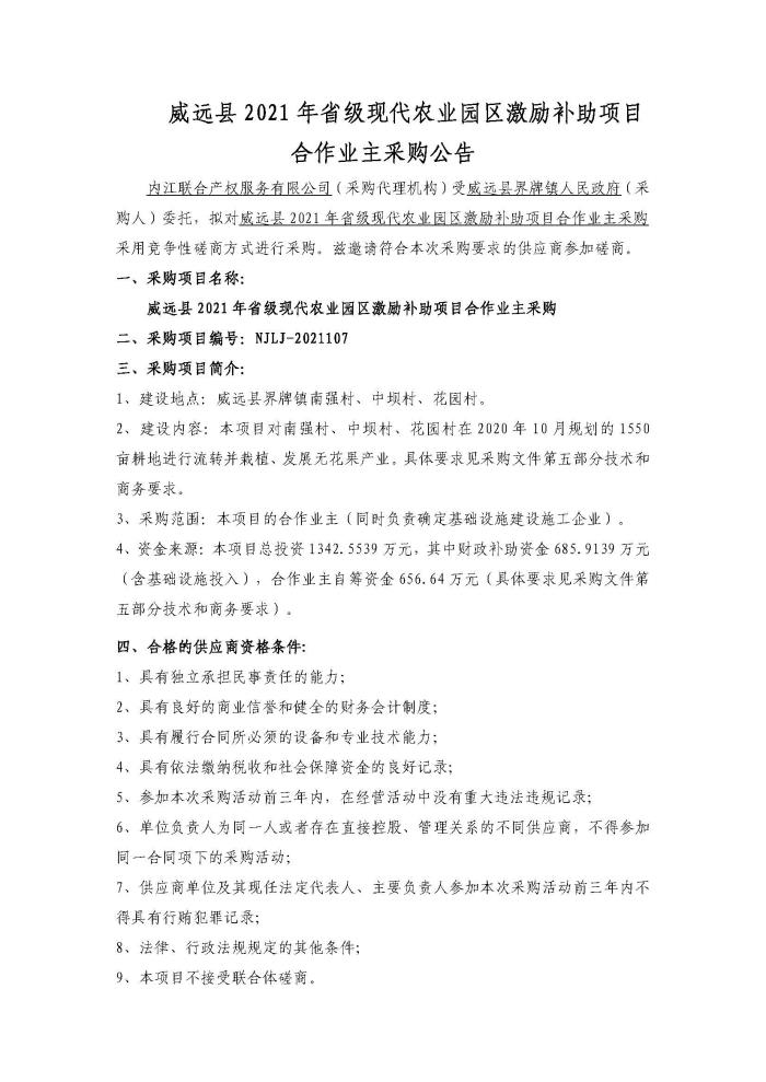 威远县2021年省级现代农业园区激励补助项目合作业主采购公告