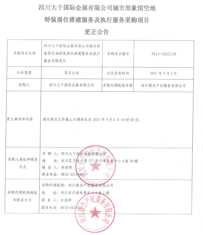 四川大千国际会展有限公司城市形象馆空地特装展位搭建服务及执行服务采购项目更正公告