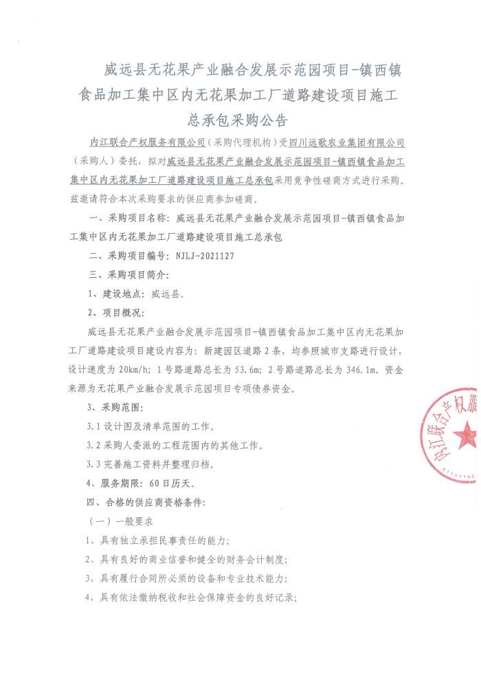 威远县无花果产业融合发展示范园项目-镇西镇食品加工集中区内无花果加工厂道路建设项目施工总承包采购公告