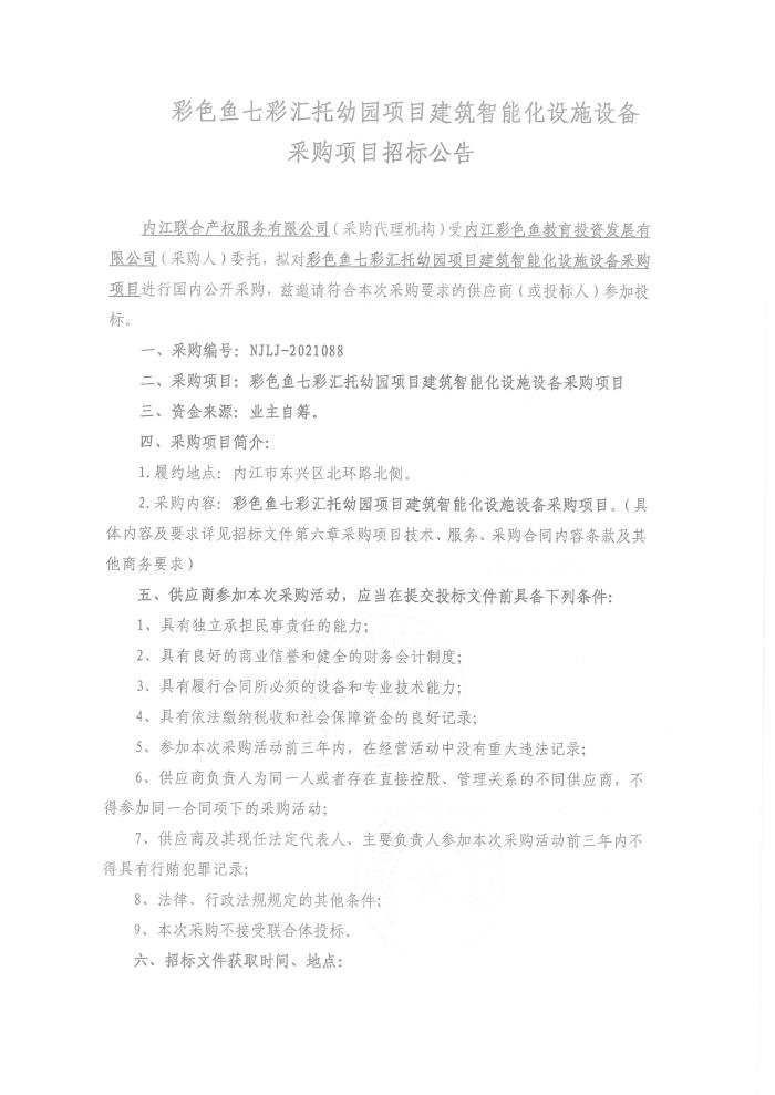 彩色鱼七彩汇托幼园项目建筑智能化设施设备采购项目招标公告